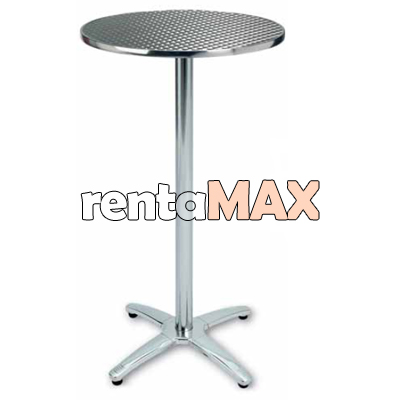 Mesa Periquera tipo bar con cubierta redonda forrada de acero inoxidable, sobre estructura y base de aluminio. Perfectas para el uso en interior o al aire libre, gracias a que estan construidas con materiales de alto rendimiento. Resistentes al agua y el sol.